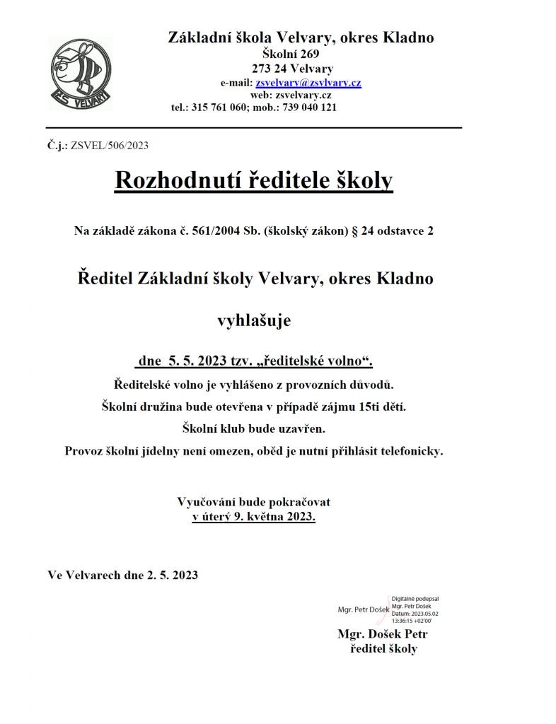 Základní škola Velvary vyhlašuje ŘEDITELSKÉ VOLNO v pátek 5. 5. 2023