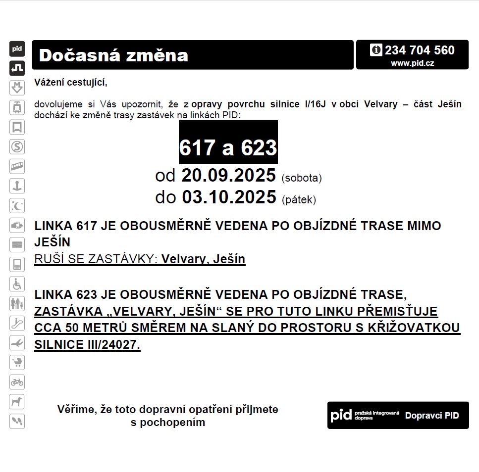 I. etapa 20.9. – 3.10. – silnice ŘSD č. I/16 (úsek od centra Ješína na kraj obce směrem na Velvary) - zastávka l. 623 u křižovatky na Osluchov, l. 617 v Ješíně nezastavuje, z l. 623 je v Žižicích garantovaný přestup na l. 593 a 594