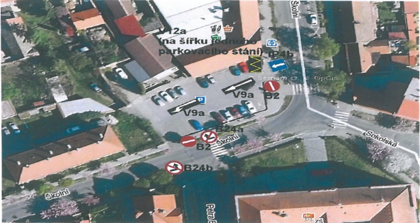 Provoz bude nově pouze jednosměrný s vjezdem na parkoviště směrem od vchodu do prodejny a s výjezdem do ulice Školní naproti Základní škole Velvary.