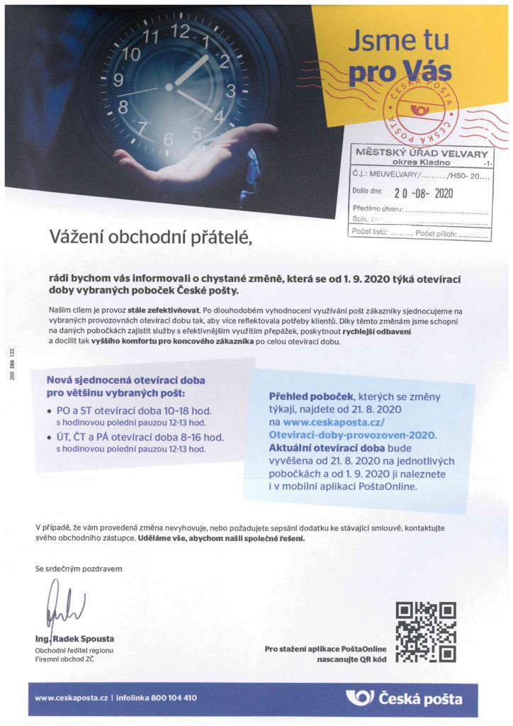 Od 1. 9. 2020 se mění pracovní doba na vybraných pobočkách České pošty: