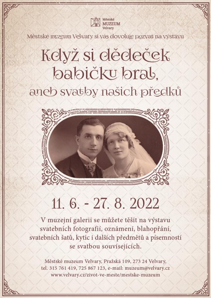 Městské muzeum Velvary vás srdečně zve na výstavu "Když si dědeček babičku bral, aneb svatby našich předků", která bude k vidění od 11.6.2022 v muzeijní galerii.