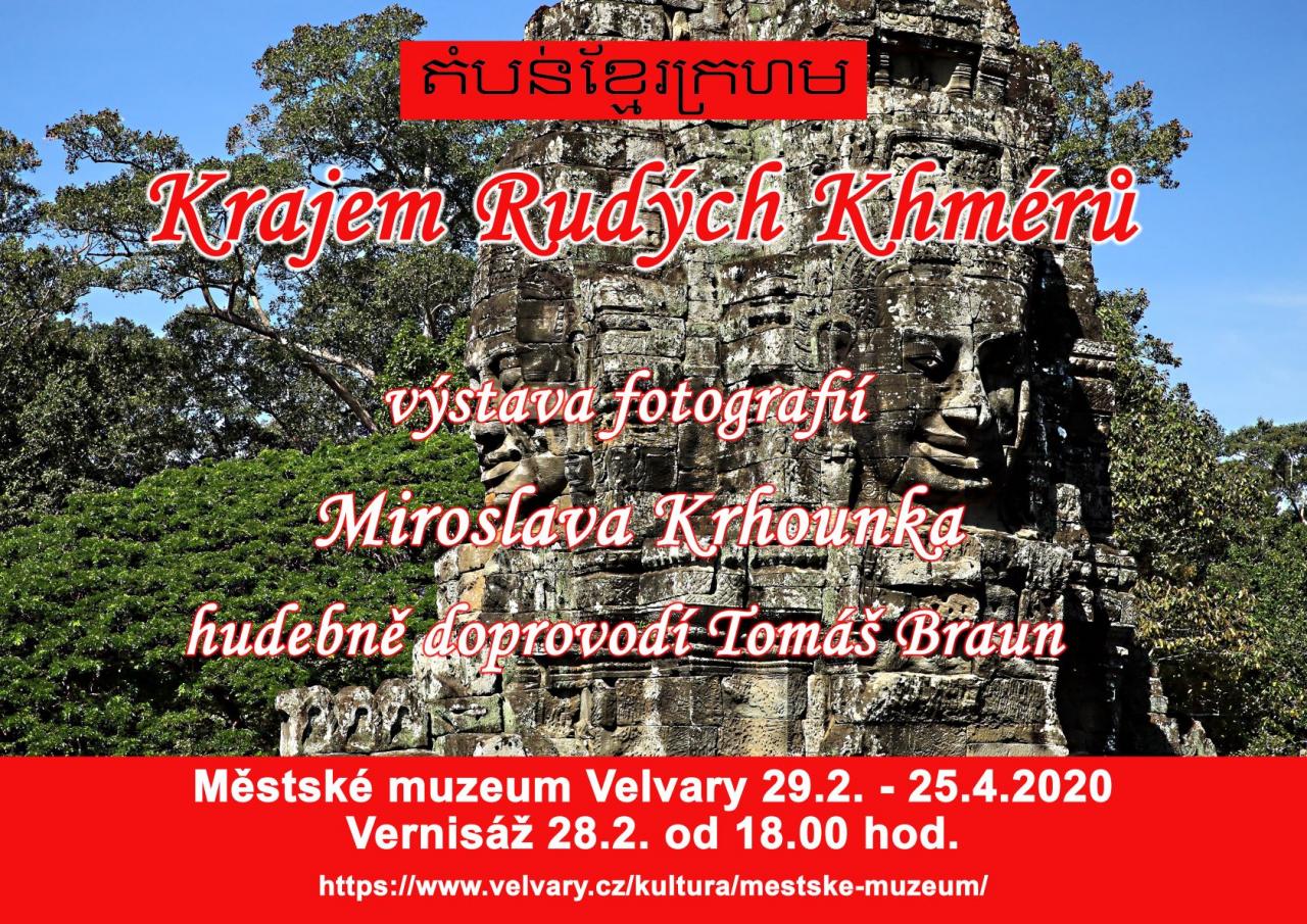 V pátek 28.2.2020 se v prostorách galerie Městského muzea Velvary konala vernisáž k výstavě velvarského fotografa Miroslava Krhounka. Výstava je věnována fotografiím z Kambodži a nese název: Krajem Rudých Khmérů. Můžete zde vidět nejen fotky historických památek, ale i krajiny, úryvky z běžného života místních či krutost bývalého vládního režimu. Zároveň se o této zemi můžete více dozvědět prostřednictvím volně dostupných materiálů. Pokud jste nestihli vernisáž, neváhejte navštívit výstavu samotnou. Velice kvalitní fotografie pana Krhounka zobrazují víc, než se na první pohled může zdát a rozhodně stojí za to je vidět na vlastní oči. K vidění budou v galerii muzea až do 25.4.2020!